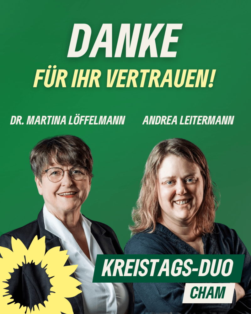Ein großer Dank gilt außerdem unseren engagierten Mitgliedern und Unterstützer*innen – ohne euren Einsatz wäre dieses Ergebnis nicht denkbar gewesen. Ihr habt GRÜNE Positionen im Landkreis Cham sichtbar gemacht. Das ist gerade in der heutigen Zeit – unabhängig vom Wahlausgang – ein wichtiger Beitrag für ein respektvolles Miteinander und eine zukunftsfähige, nachhaltige Entwicklung für alle Generationen.